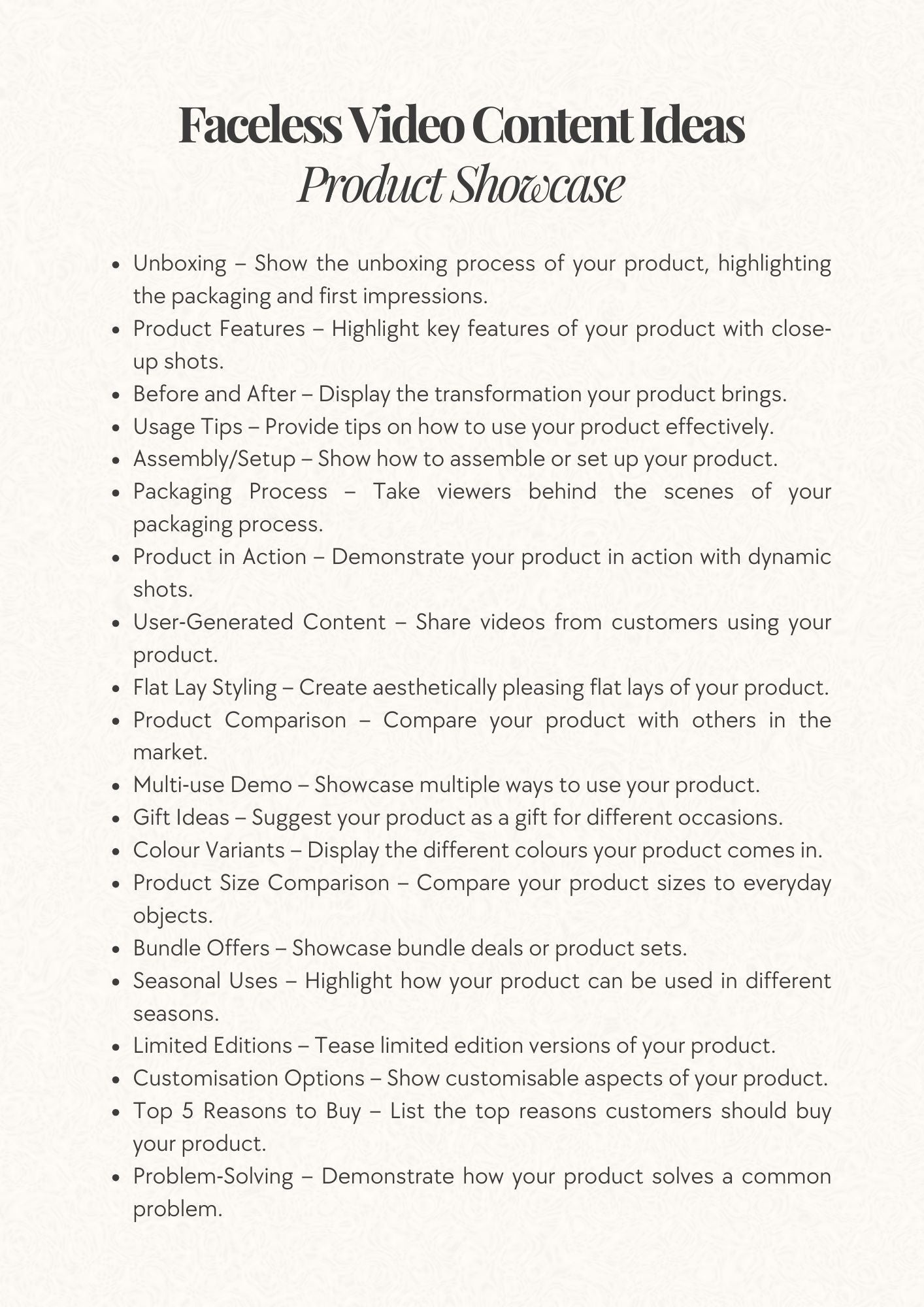 From clever POV shots and hands-only tutorials to creative product showcases and aesthetic B-rolls, each idea is crafted to captivate your viewers without the need for on-camera appearances. You’ll get tips on how to use lighting, props, and editing techniques to make your videos visually appealing and viral-ready.