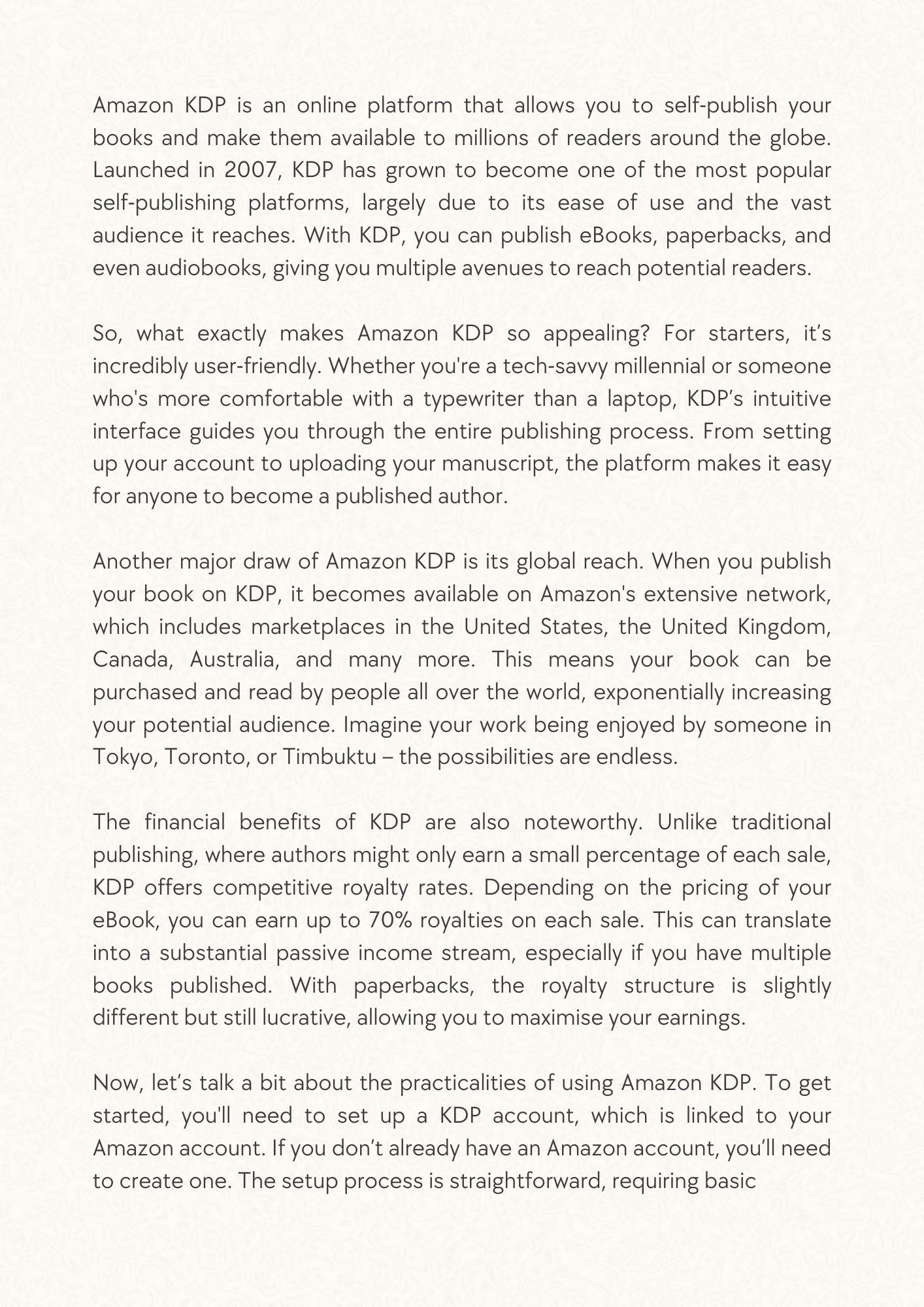 Ready to turn your writing or creative ideas into a steady stream of passive income? With *Earn Passive Income with Amazon KDP*, you’ll learn how to leverage Amazon’s Kindle Direct Publishing (KDP) platform to create, publish, and profit from your very own books, no matter your writing experience!