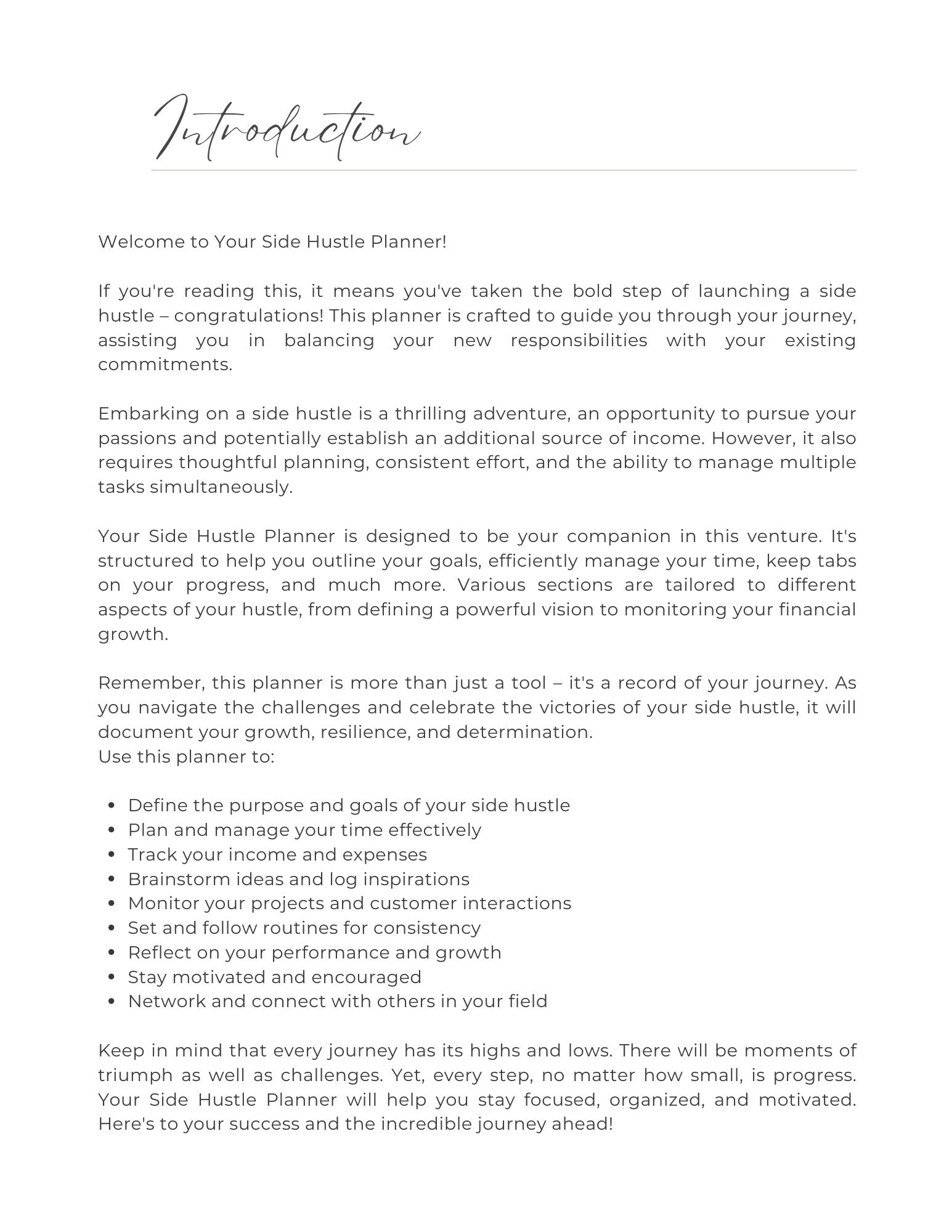 Stay organized and maximize your earnings with the *Side Hustle Tracker*! This all-in-one digital tracker is designed for entrepreneurs, freelancers, and side hustlers looking to manage their multiple income streams efficiently. Whether you're juggling a part-time business, freelance gigs, or passive income projects, this tracker will help you keep track of your goals, finances, and progress all in one place.